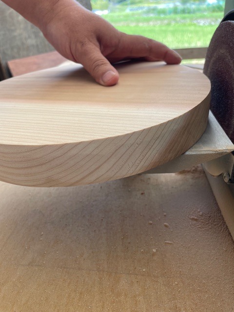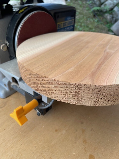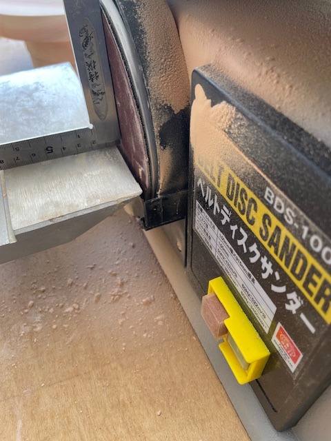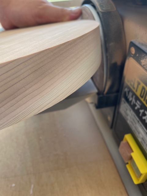 ・今回の材料は、円なので押し当てすぎると歪な形になってしまいますので、ディスクサンダーでゆっくり慎重に研磨していきます。