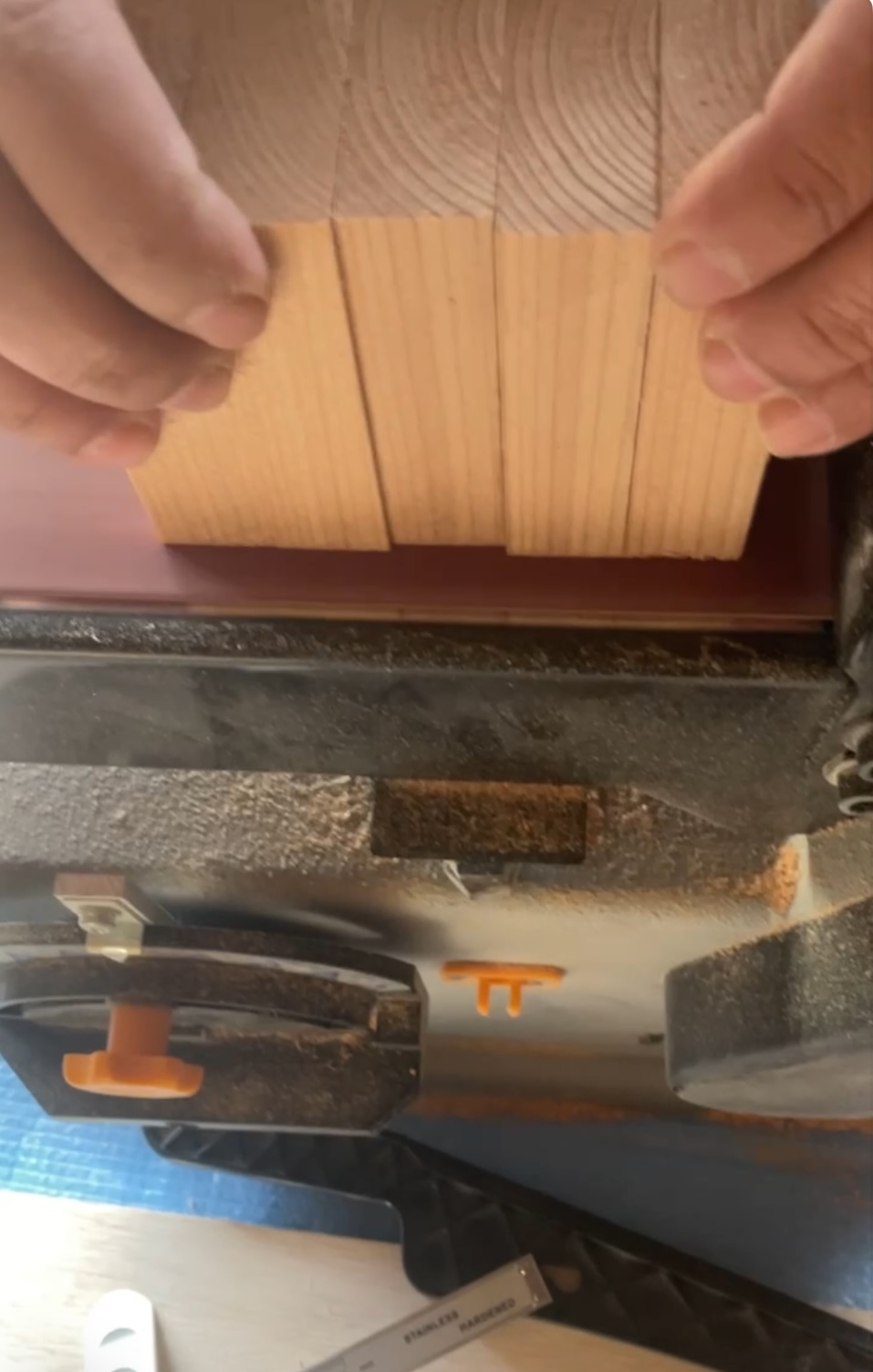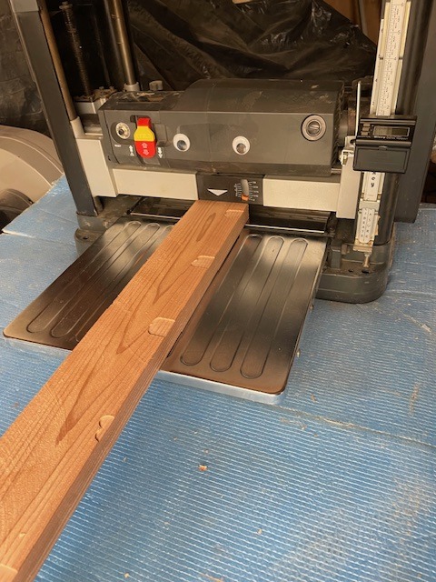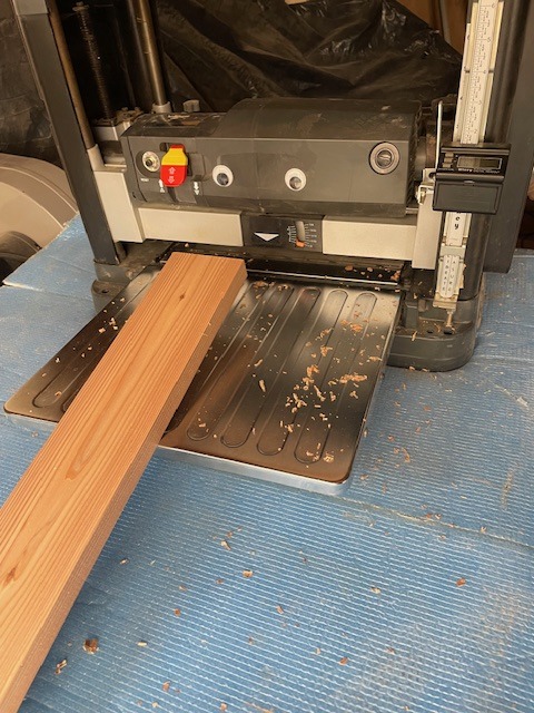 何かで使った、2×4材の余りがあったので、26mmにテーブルソーでスライスしました。凹みが消えるところまで、プレナーで削ります。