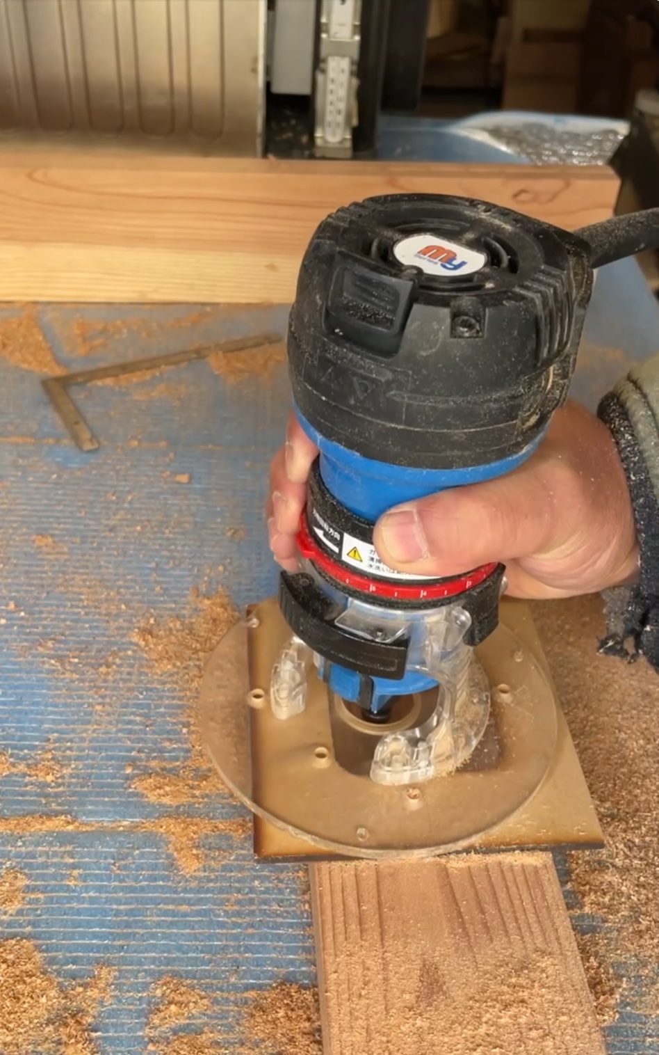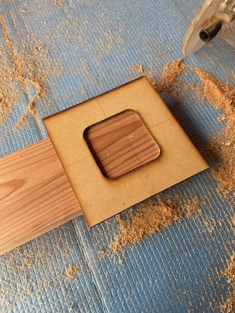 先程の材料にテンプレートを両面テープで固定しトリマーの倣い加工で掘り下げていきます。