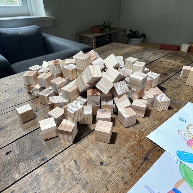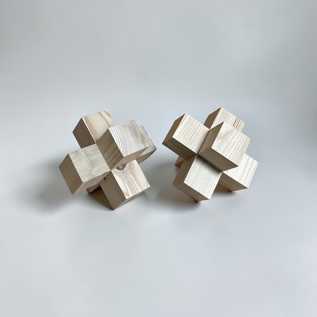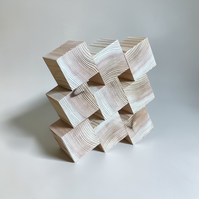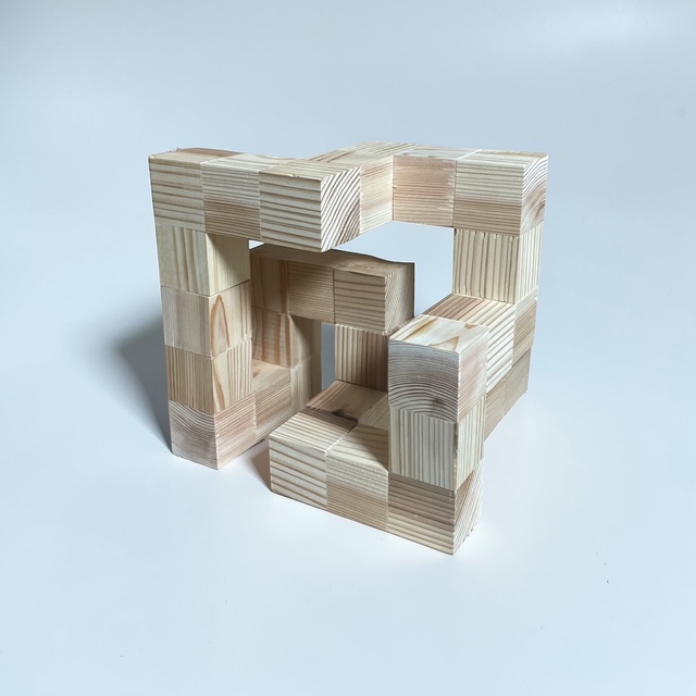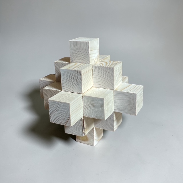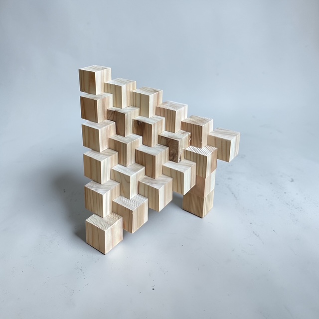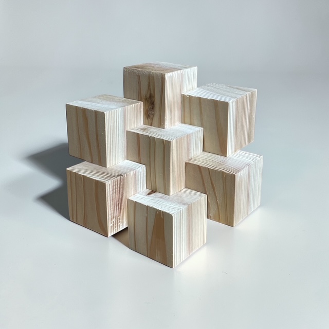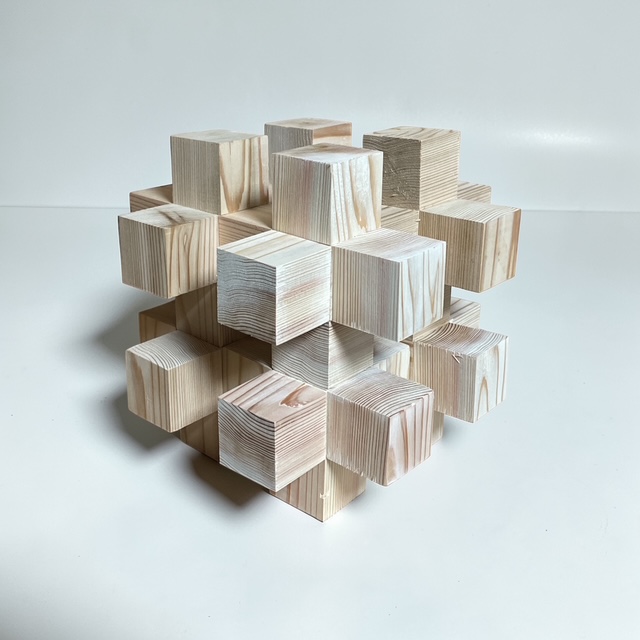 最初はただの小さな立方体の集まり。でも、並べ方や接着の仕方を少し工夫するだけで、まるで彫刻作品のような立体へと変化していきます。規則的に積み上げてみたり、あえてランダムに配置してみたり。木目の向きや光の当たり方によっても、表情がぐっと変わるのが面白いところです。