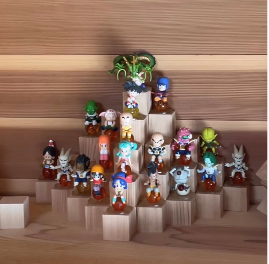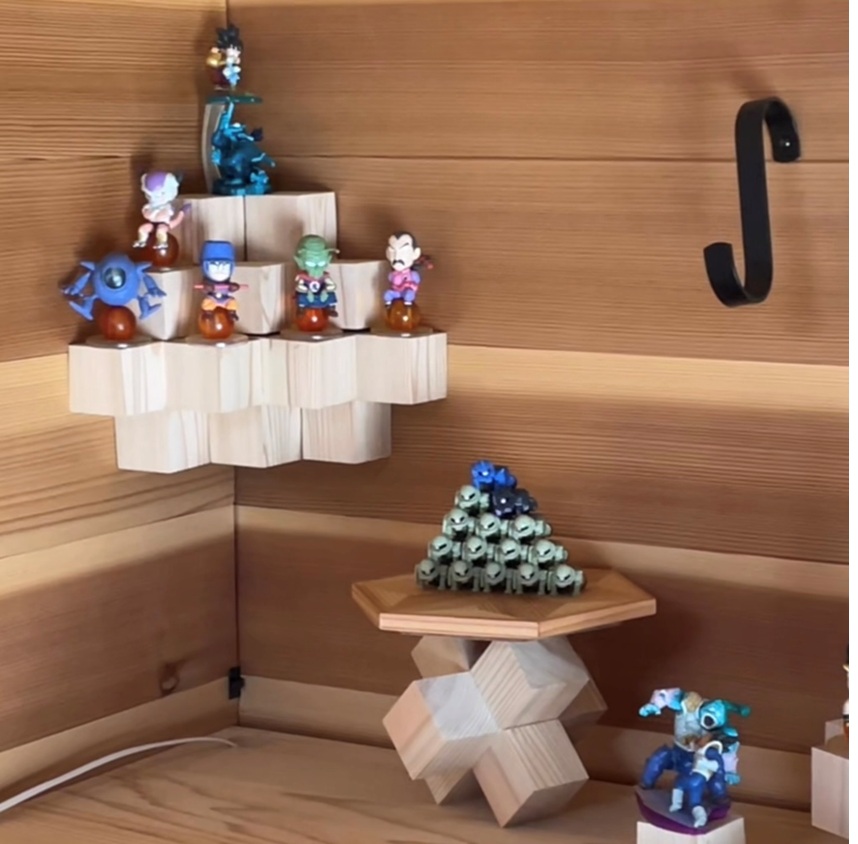 小さなフィギアが大量にあるので、いろいろ陳列方法を悩んだ結果、全てのフィギアの顔が見えるようにひな壇タイプのディスプレイ台がいいかなぁーと思い吉野杉でDIYしました。