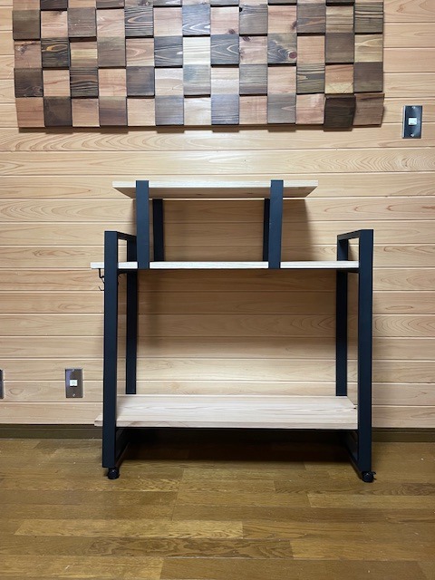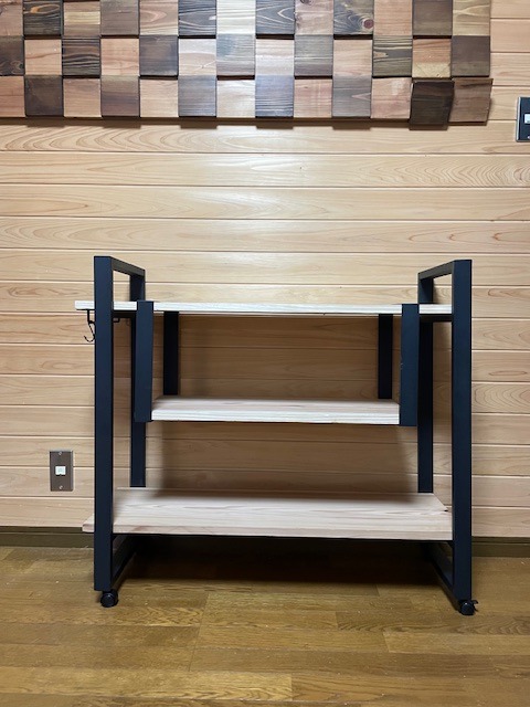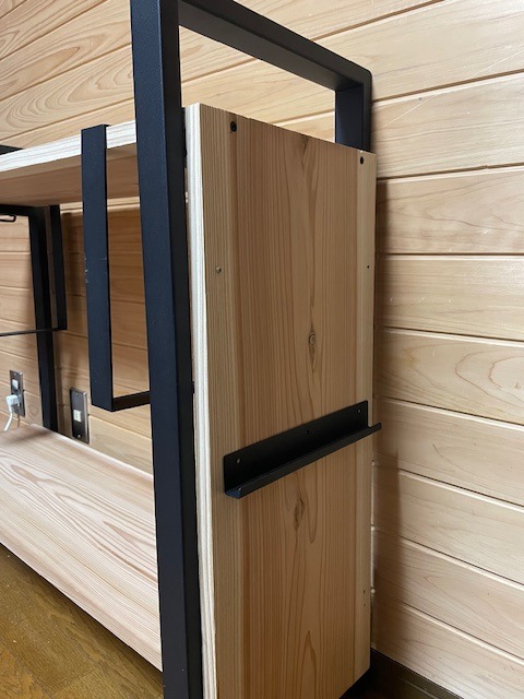 ※アイアンシェルフフレーム51シリーズの2段タイプに棚板には、吉野杉厚み19mm幅280mm長さ910mmを組み合わせています。