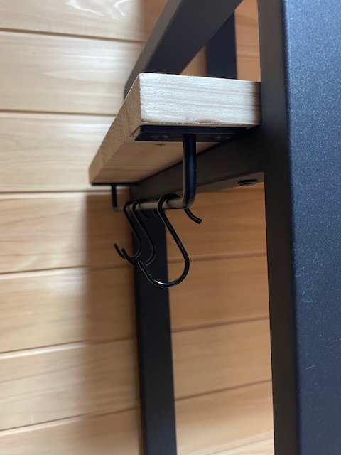 棚板をフレームピッタリ(ツラ)に取付けるのではなく、フレームの外側に5cm 以上出すことで、アイアンハンガーバーの取付けが可能になります。当店のHB250は、棚板の奥行にジャストサイズですので違和感なくシェルフに馴染みます。タオルを掛けたり、S字フックを使ってちょっとしたものを引っ掛けたりと、とても便利で機能的なカスタマイズです。