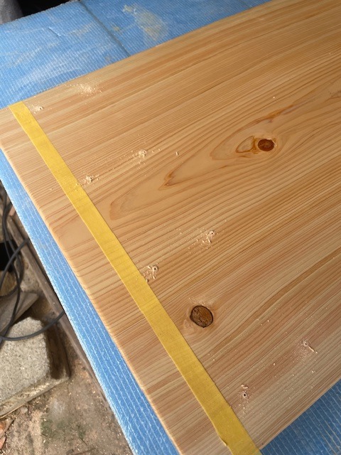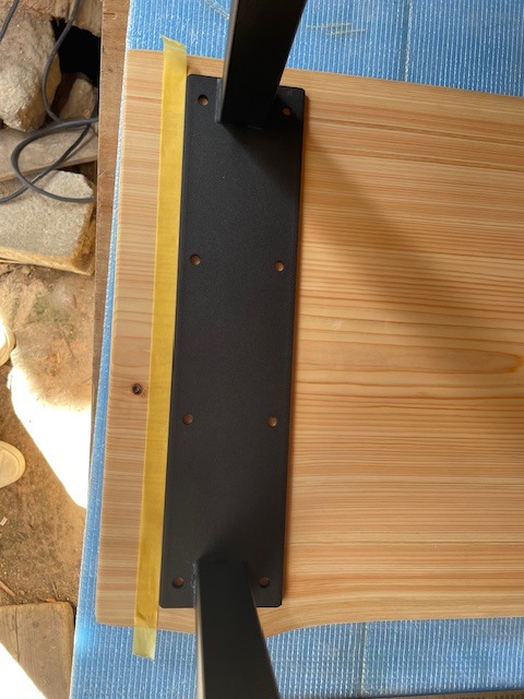 ・今回は、アイアン脚の端が天板の端から5cmの位置に取付けることにしました。念のために印として、マスキングテープを貼付けました。