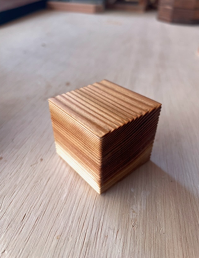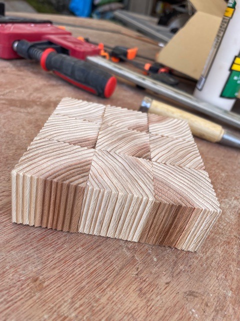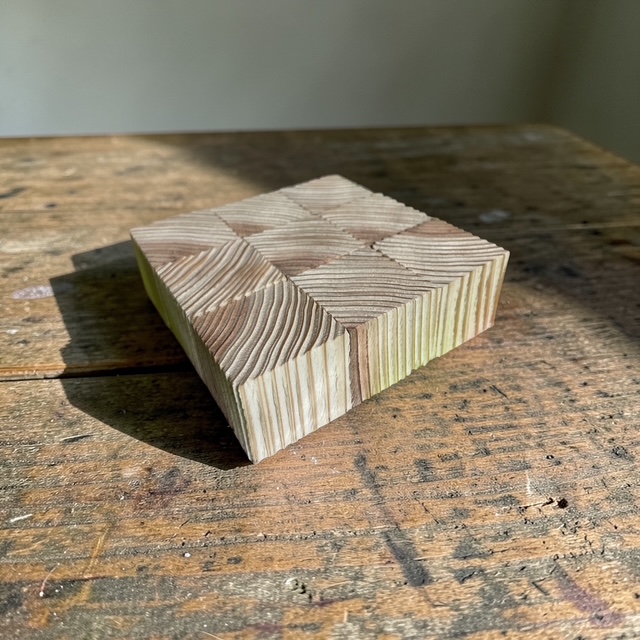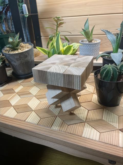意外と簡単に早くできたので、浮造りサイコロを張り合わせてディスプレイ台を作ってみました。