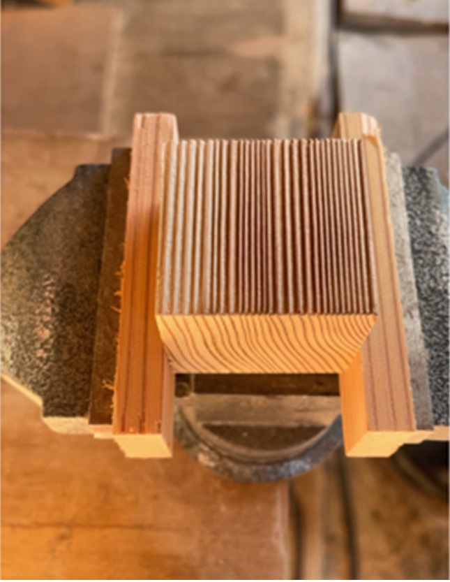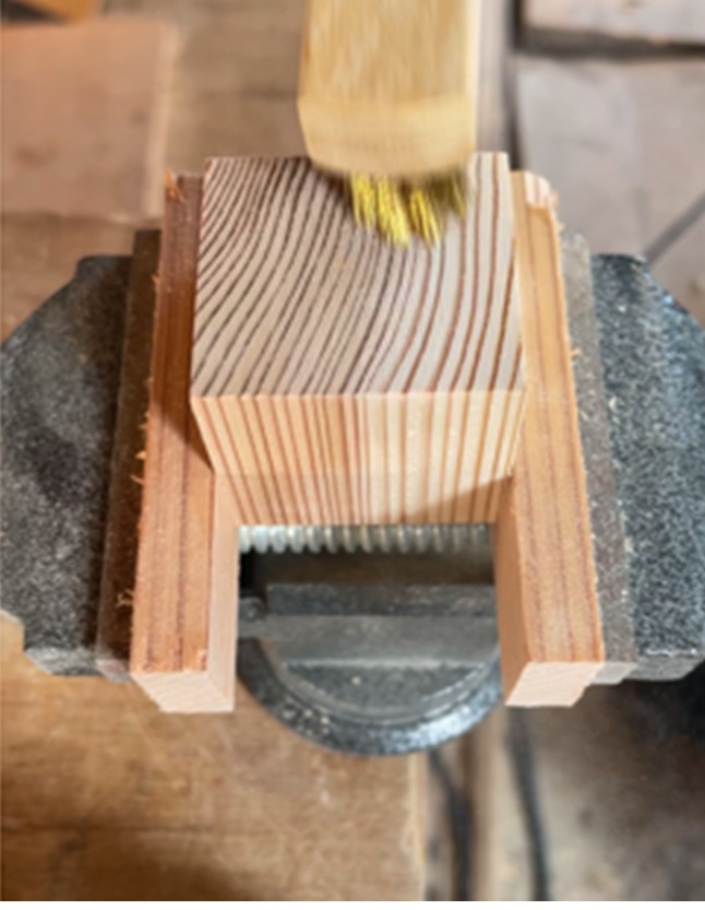 バイスでしっかり固定し、真鍮ブラシでこすっていきます。約10分ほど作業すると、柔らかい夏目が削れ、冬目が少しずつ浮き上がってきました。